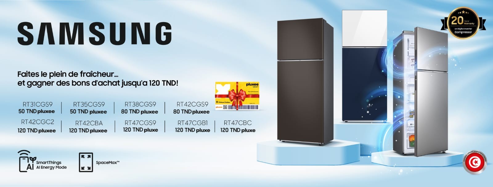 Réfrigérateurs, machines à laver, climatiseurs et autres équipements Samsung allient modernité, efficacité énergétique et connectivité via SmartThings pour une maison intelligente et confortable. Profitez aussi d’un service après-vente fiable en Tunisie
